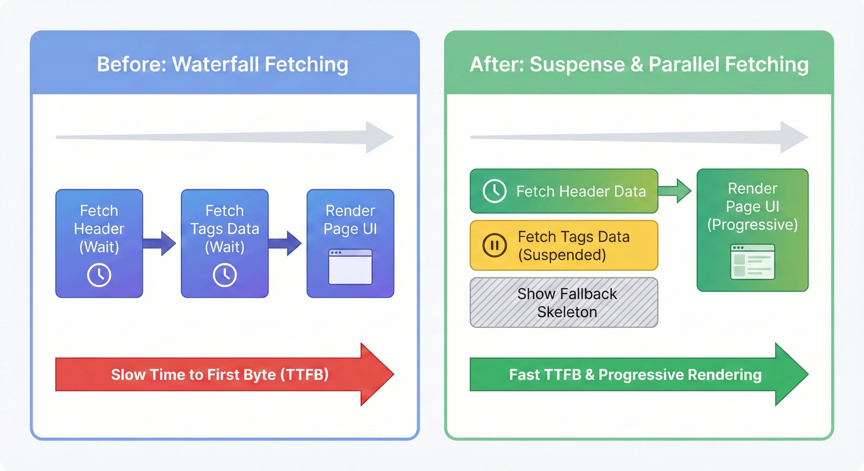 }이 패턴은 느린 데이터가 있더라도 페이지의 다른 부분(Header 등)을 즉시 보여주어(TTFB 개선) 사용자 경험을 향상시킵니다.