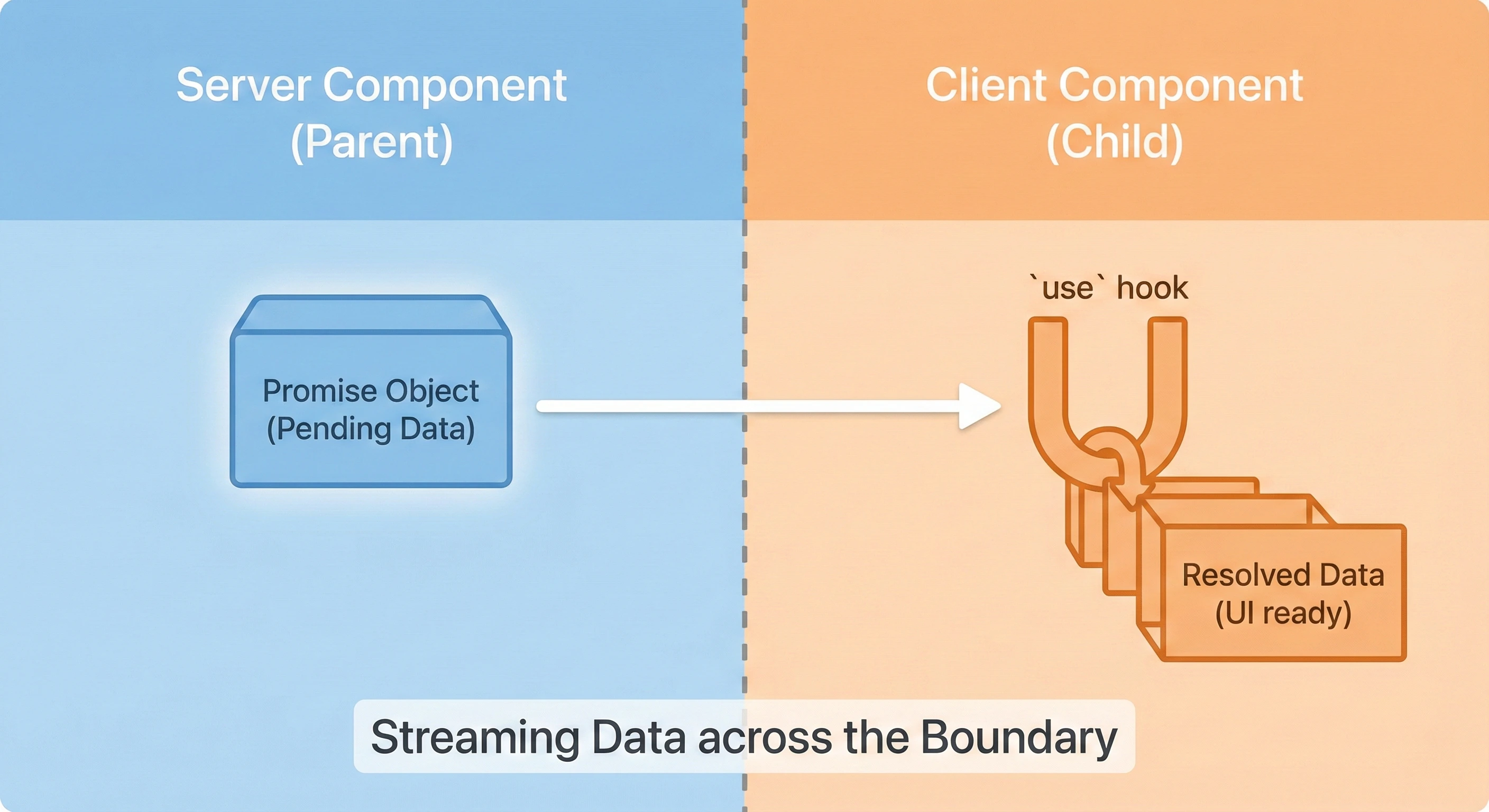 클라이언트 컴포넌트에서도 비동기 데이터를 선언적으로 처리하기 위해 **"Promise를 Props로 전달하고 use 훅으로 해제(Unwrap)하는 패턴"**을 사용합니다. 이를 통해 클라이언트 컴포넌트에서도 스트리밍의 이점을 누릴 수 있습니다.