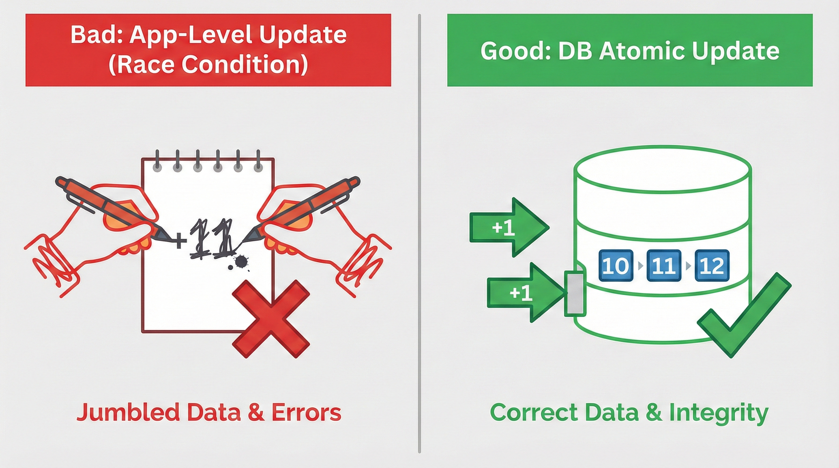 애플리케이션 레벨에서 값을 읽고(read) 1을 더해 쓰는(write) 방식은 경쟁 상태에 취약합니다. 대신 DB에게 연산을 위임해야 합니다.