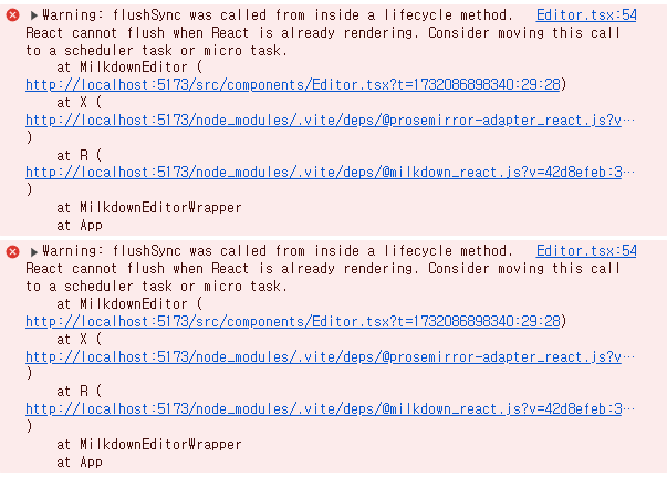 내에서 에디터를 초기화할 때 이 로직이 실행되면서, 이미 진행 중인 React 렌더링 사이클과 flushSync