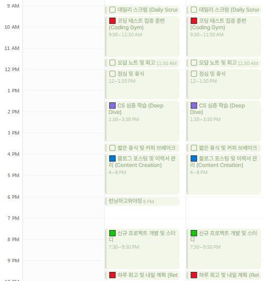 감정에 휘둘리지 않기 위해서 하루를 블록 단위로 쪼개서 관리했습니다. 모닝 루틴부터 시작해서 알고리즘 문제 풀이, CS 딥다이브 시간, 프로젝트 진행 시간, 면접 연습 등을 블록으로 잡았습니다. 하루를 이렇게 잡고 보내다 보니, 지난 부스트캠프에서 보냈던 깨우침들이 자연스럽게 연결되는 느낌을 받았습니다.