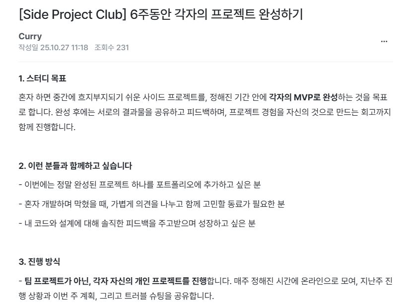 생각해보니 개인 프로젝트를 크게 진행해본 적은 없어서, 스스로를 푸시하기 위해 사이드 프로젝트 스터디를 개설했습니다. 생각보다 많은 분들이 지원해주셨고 대부분 취준생 분들이 지원해줄 것이라고 생각했던 것과는 달리 현업자분들이 많이 참여해주셨습니다.
